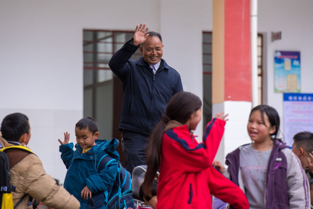 2025年2月18日,在落松地小学,农加贵(中)下课后和学生挥手告别。新华社记者彭奕凯摄