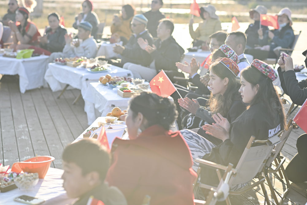 江苏泰州援疆干部人才与昭苏农牧民家庭代表齐聚,观看节目(2025年10月6日摄)。新华社记者胡虎虎摄